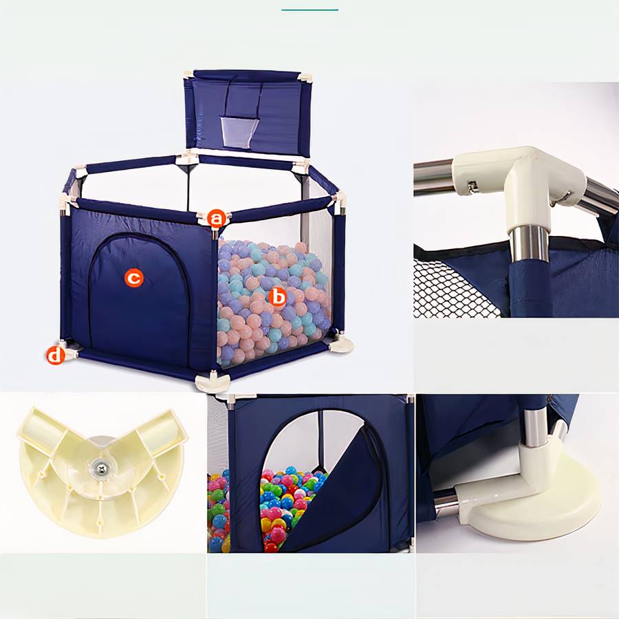 Le fond est recouvert d'un tissu doux et confortable, qui permet à votre bébé de jouer en toute sécurité. Avec son design attrayant et ses couleurs vives, ce parc de jeux bleu piscine à balles pour bébé est le complément parfait pour votre maison.
